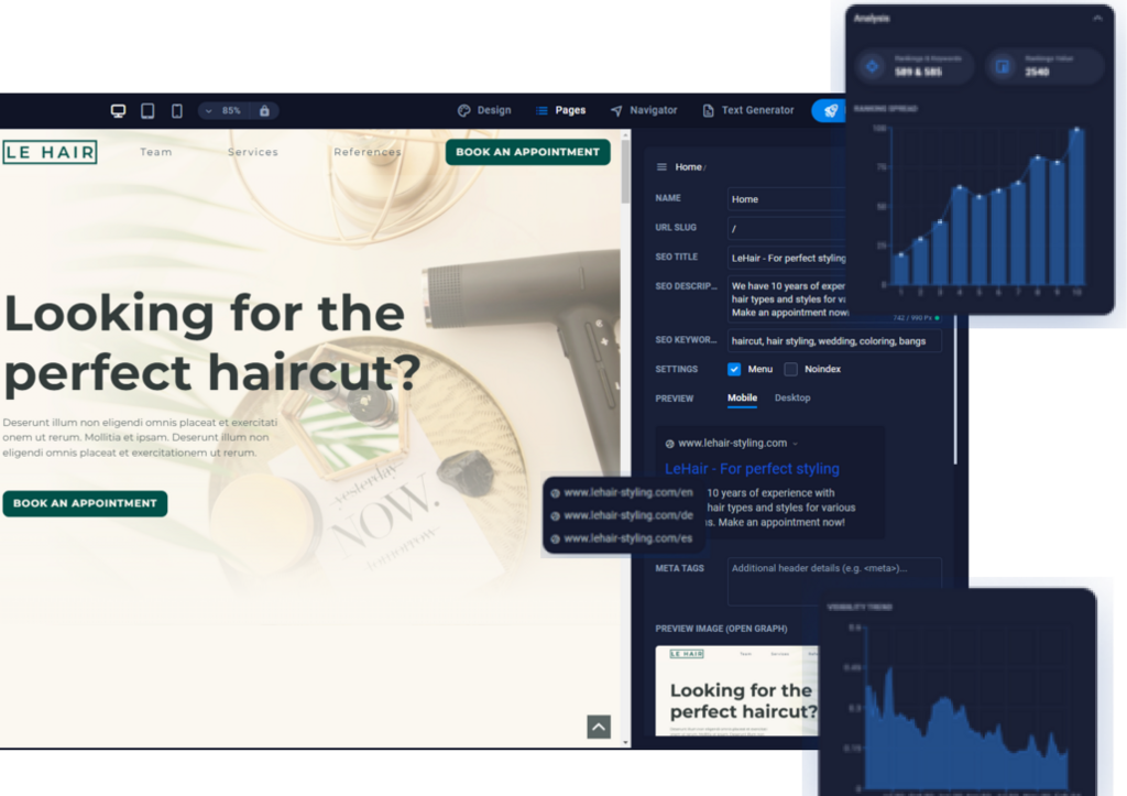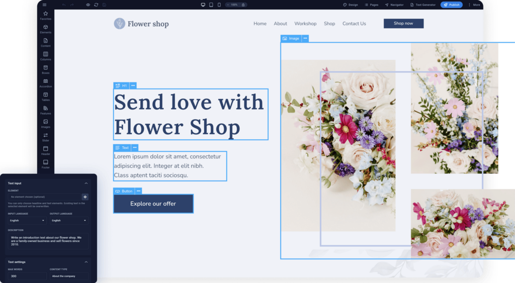 Affascina i visitatori del tuo sito web con contenuti accattivanti e immagini accattivanti grazie al generatore di testo AI integrato e alle foto d'archivio gratuite.